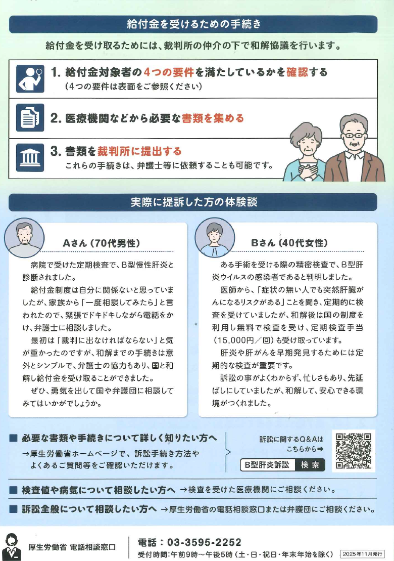 B型肝炎に関する給付金 厚生労働省 電話相談窓口 ℡03-3595-2252